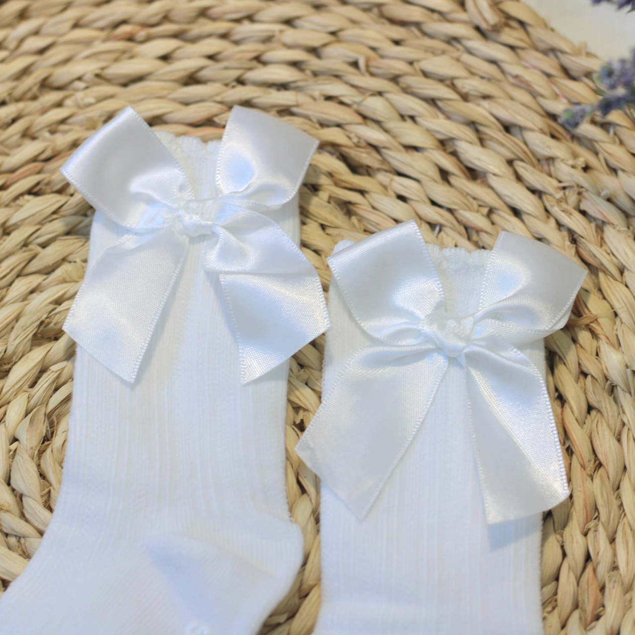 Calcetas a media pierna, con lazo de razo.