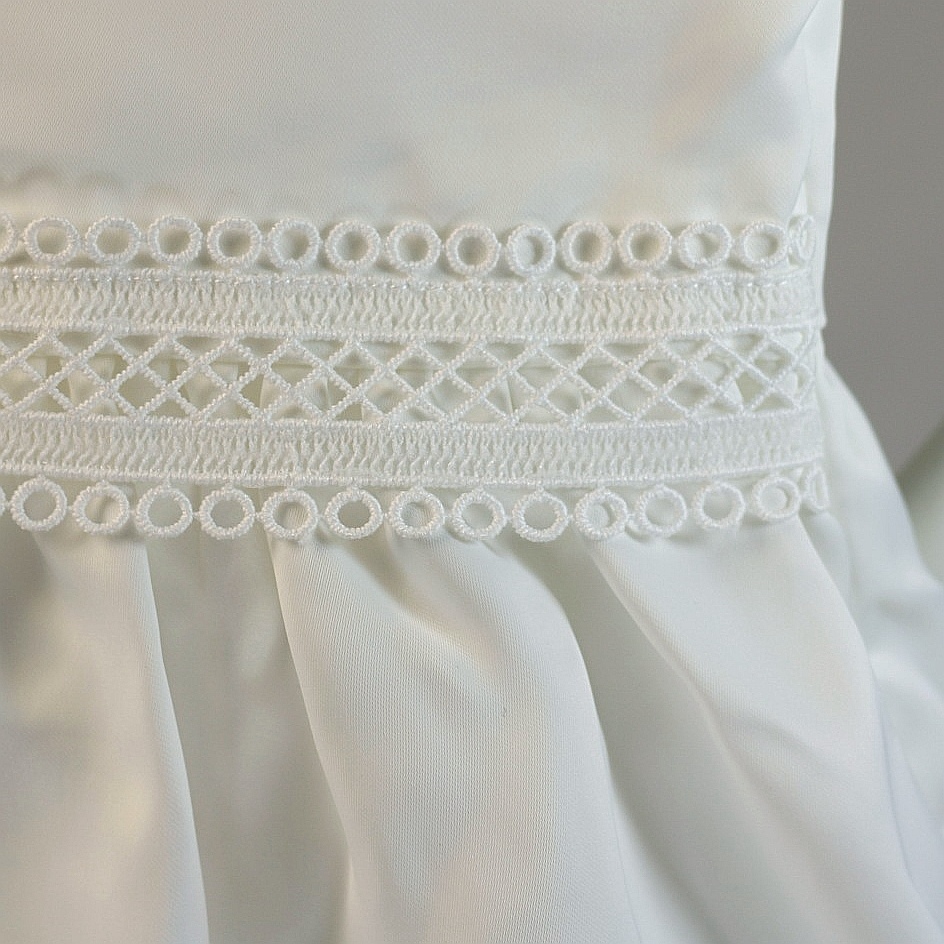 Tela algodon, decorado con encaje de hilo, forrado por dentro, botones en la parte de atras, incluye sombrerito o Boina.