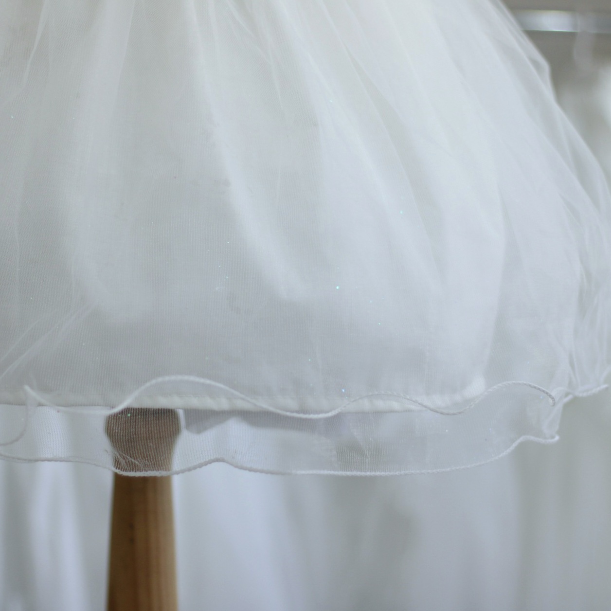 Vestido blanco para Bautizo y Primera Comunión, con bellos detalles, falda de tull con puntitos brillantes. Tiene falso