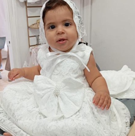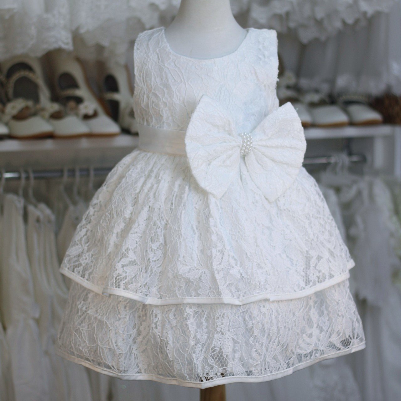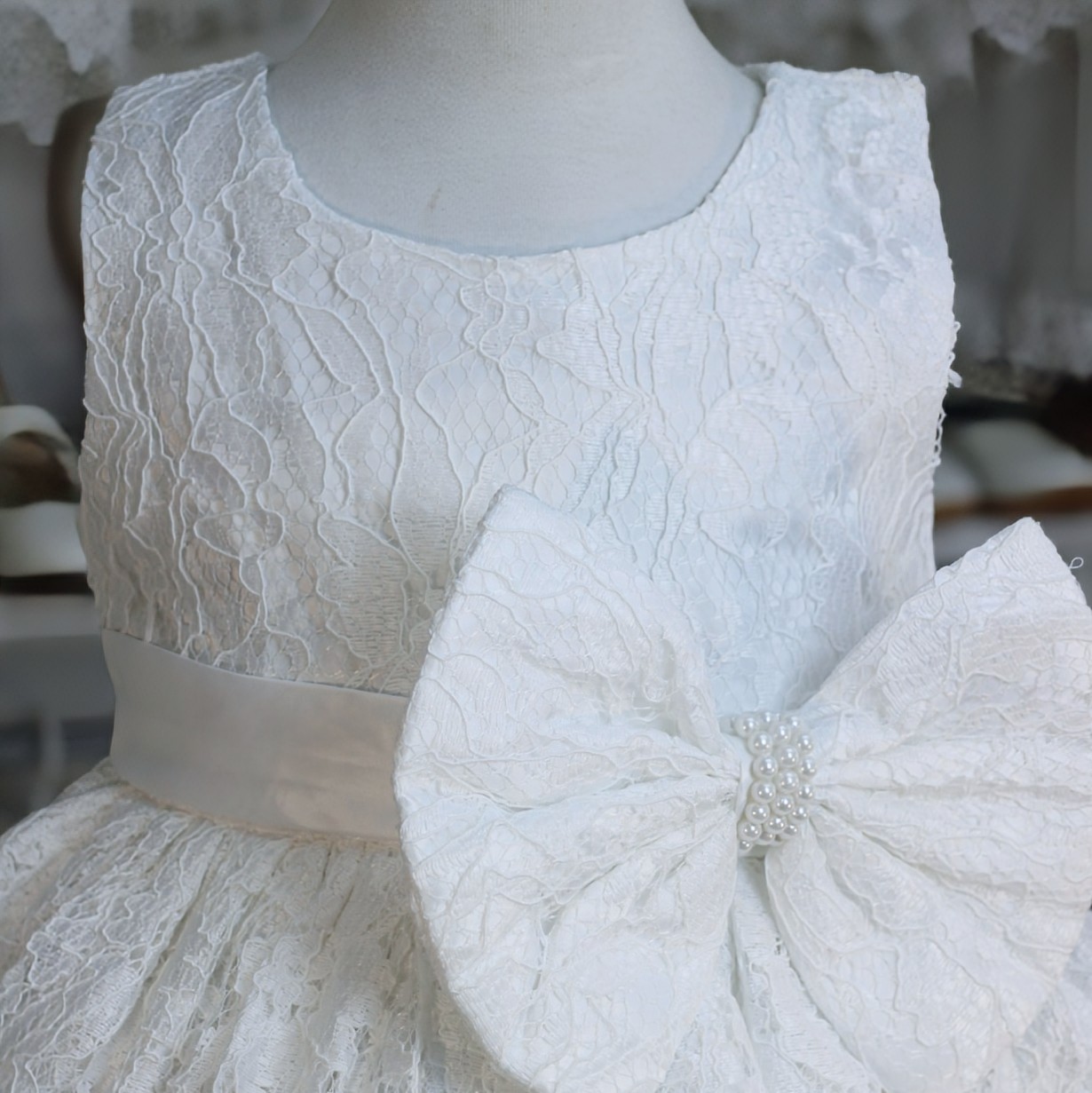 Vestido blanco para Bautizo, de tela bordada y lazo con perlas.