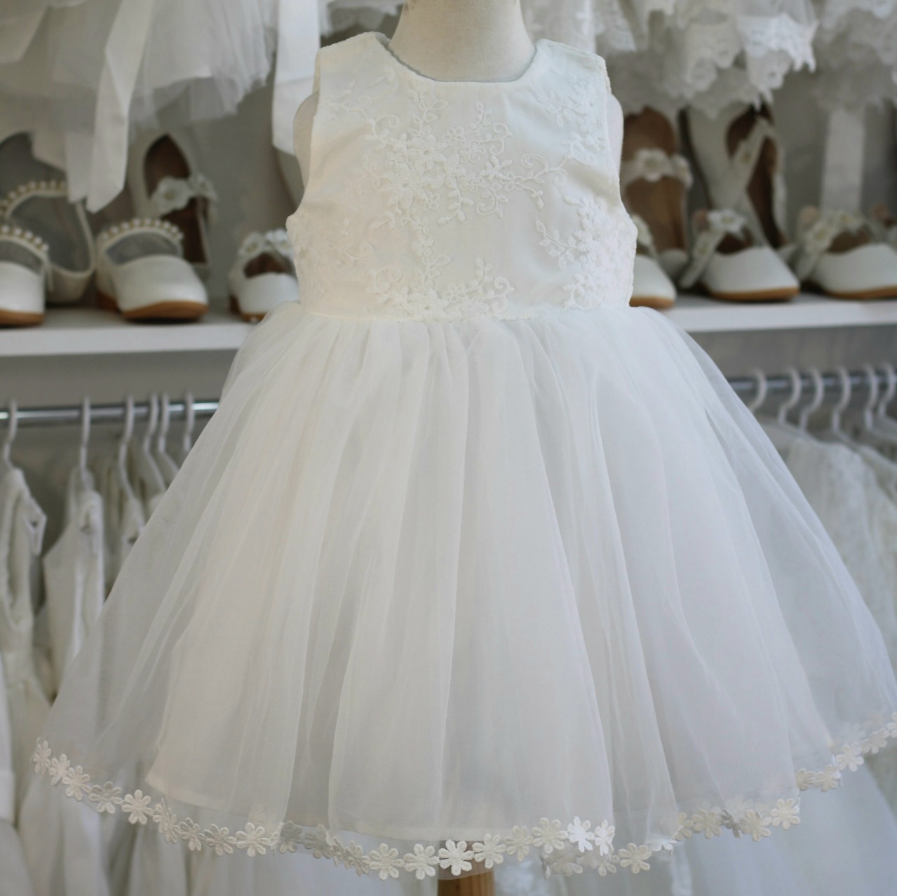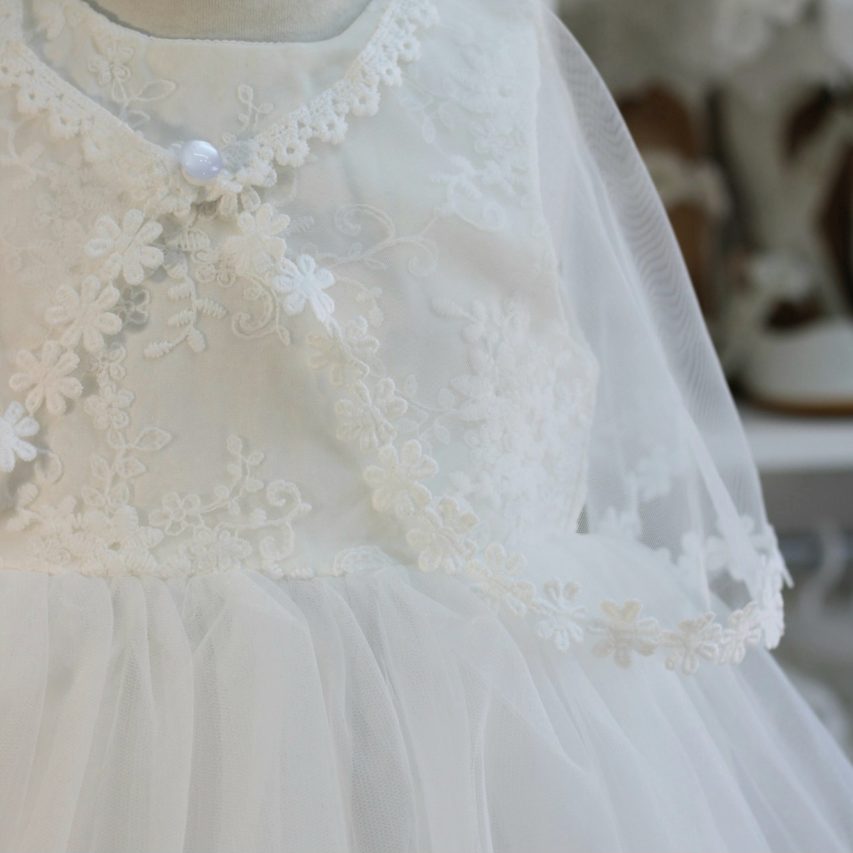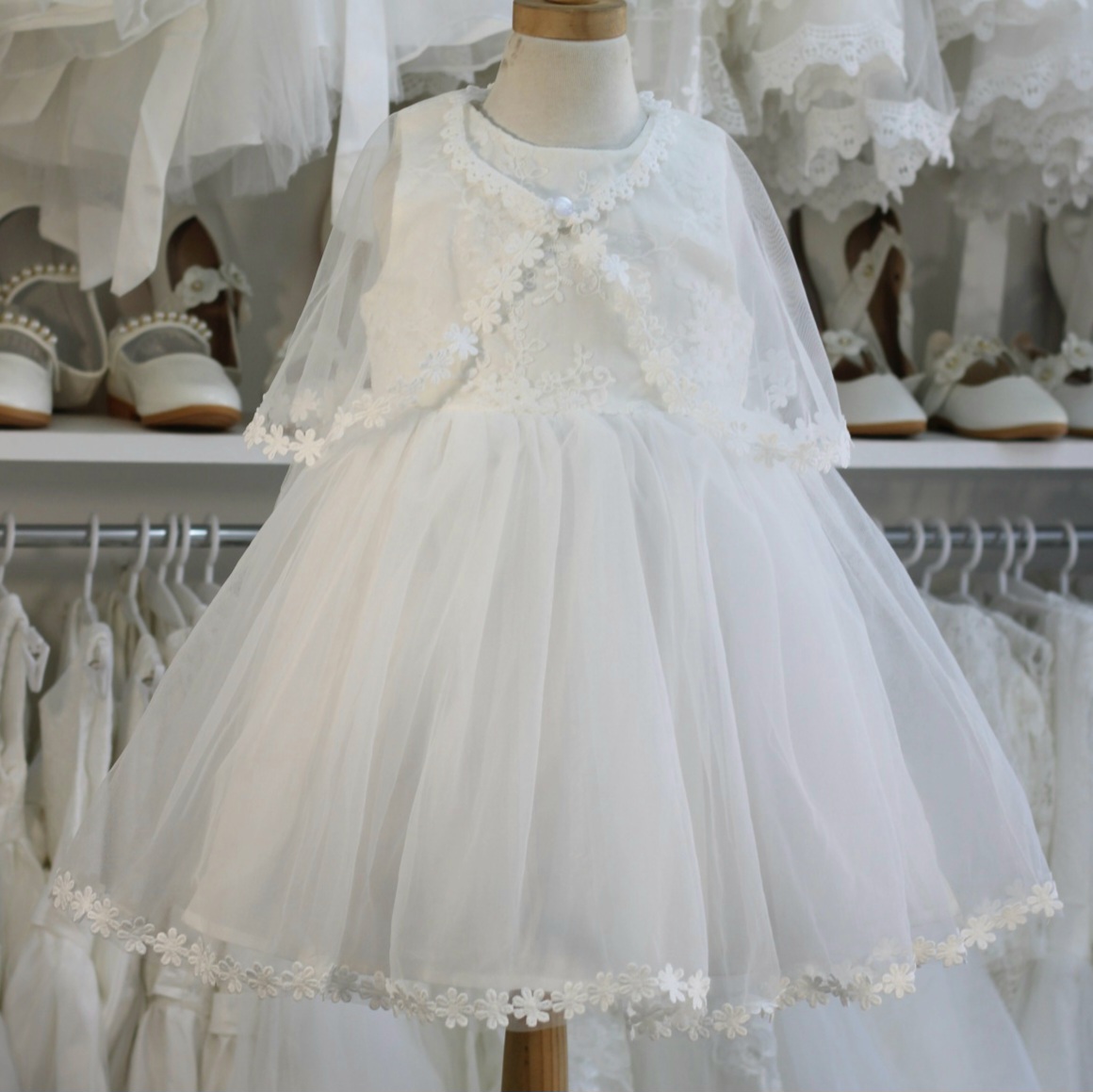 Vestido blanco para Bautizo , tela bordada y tul. incluye una pequeña capa
