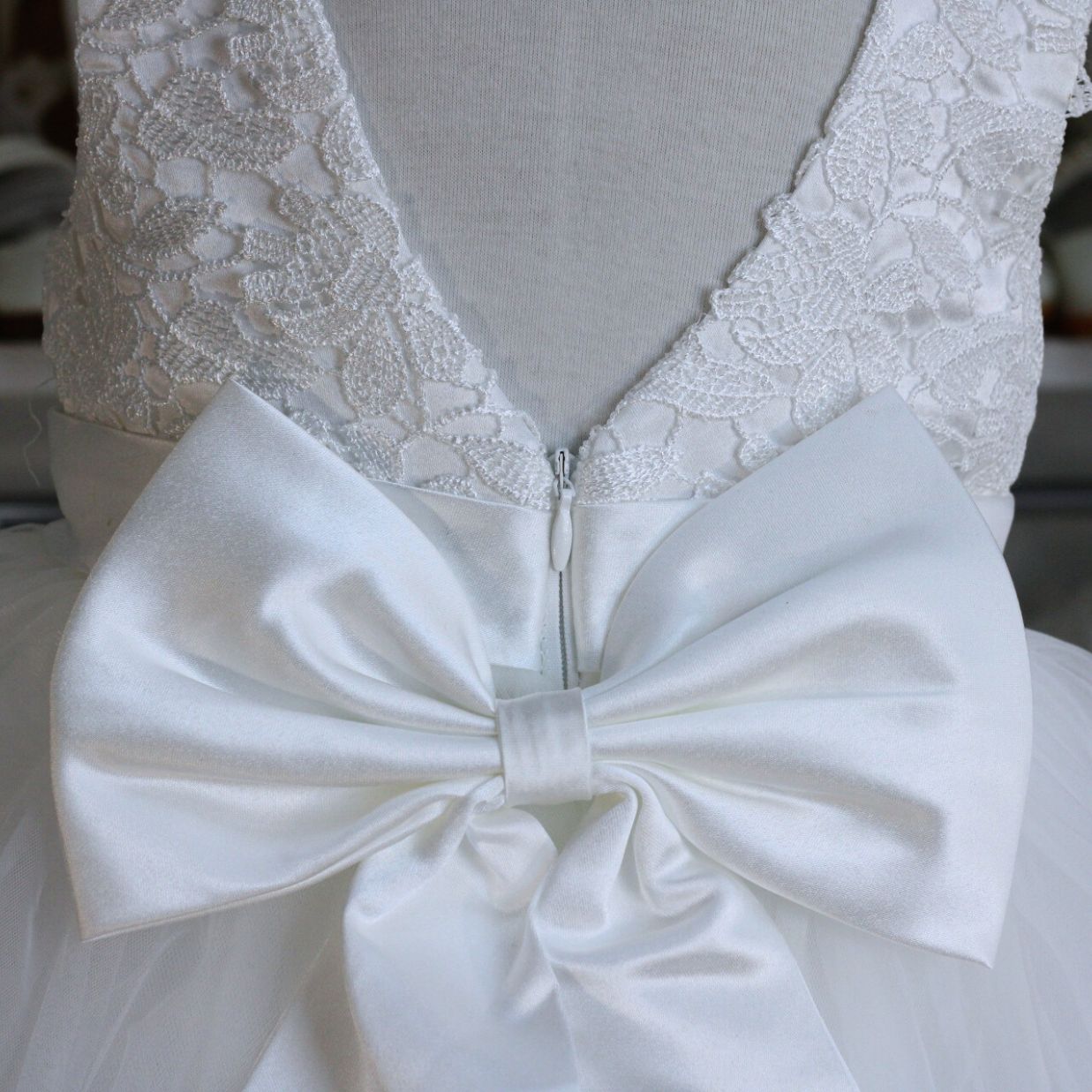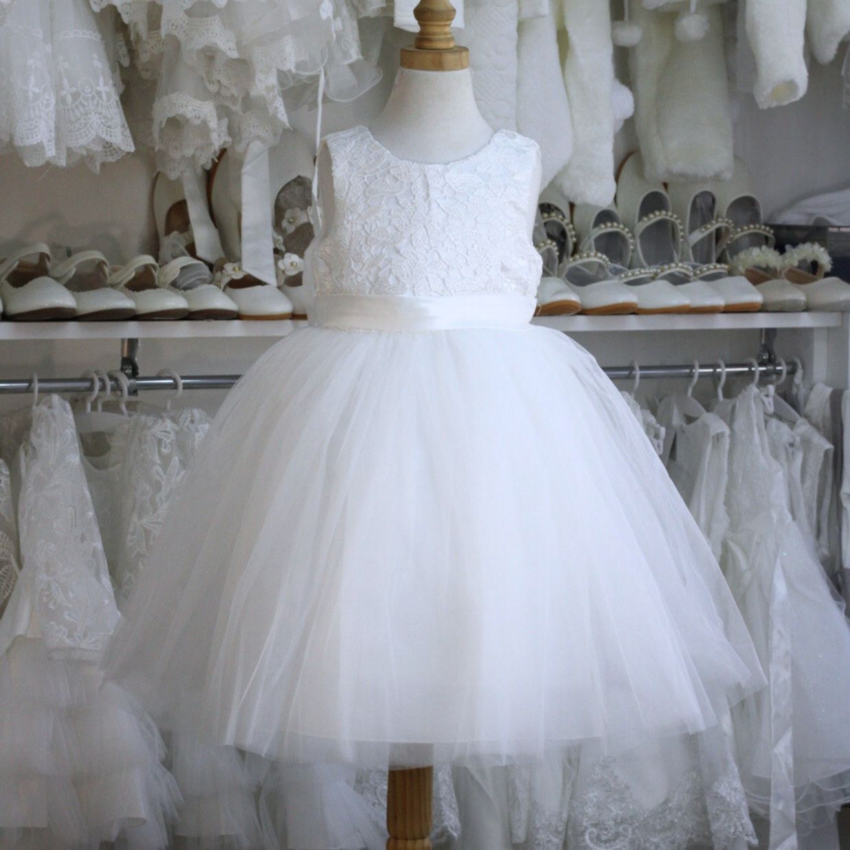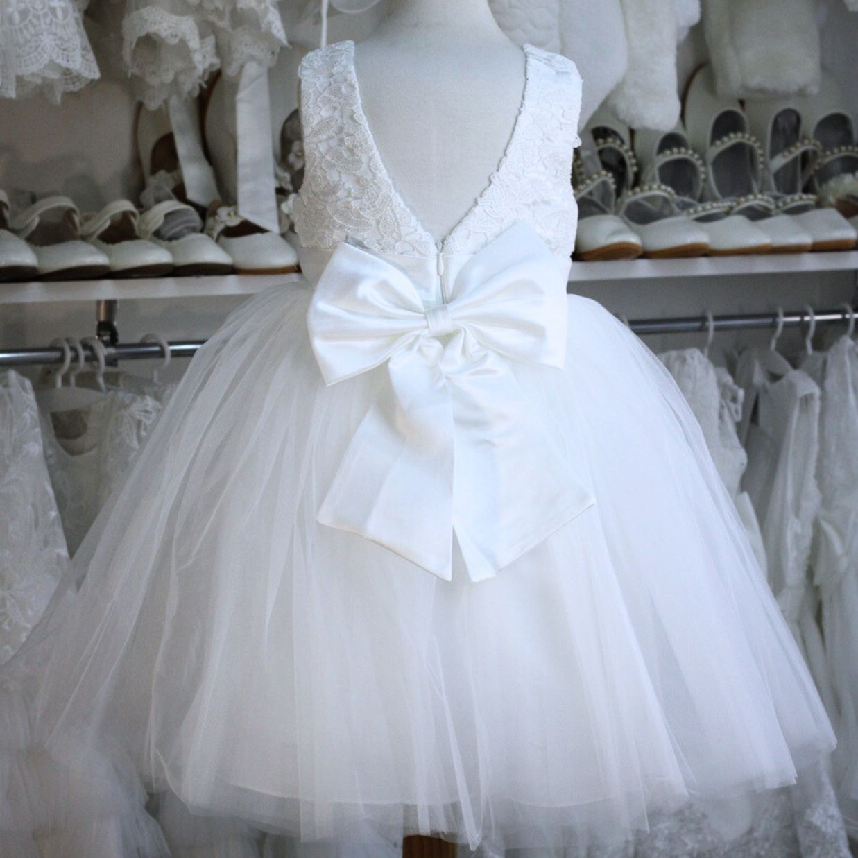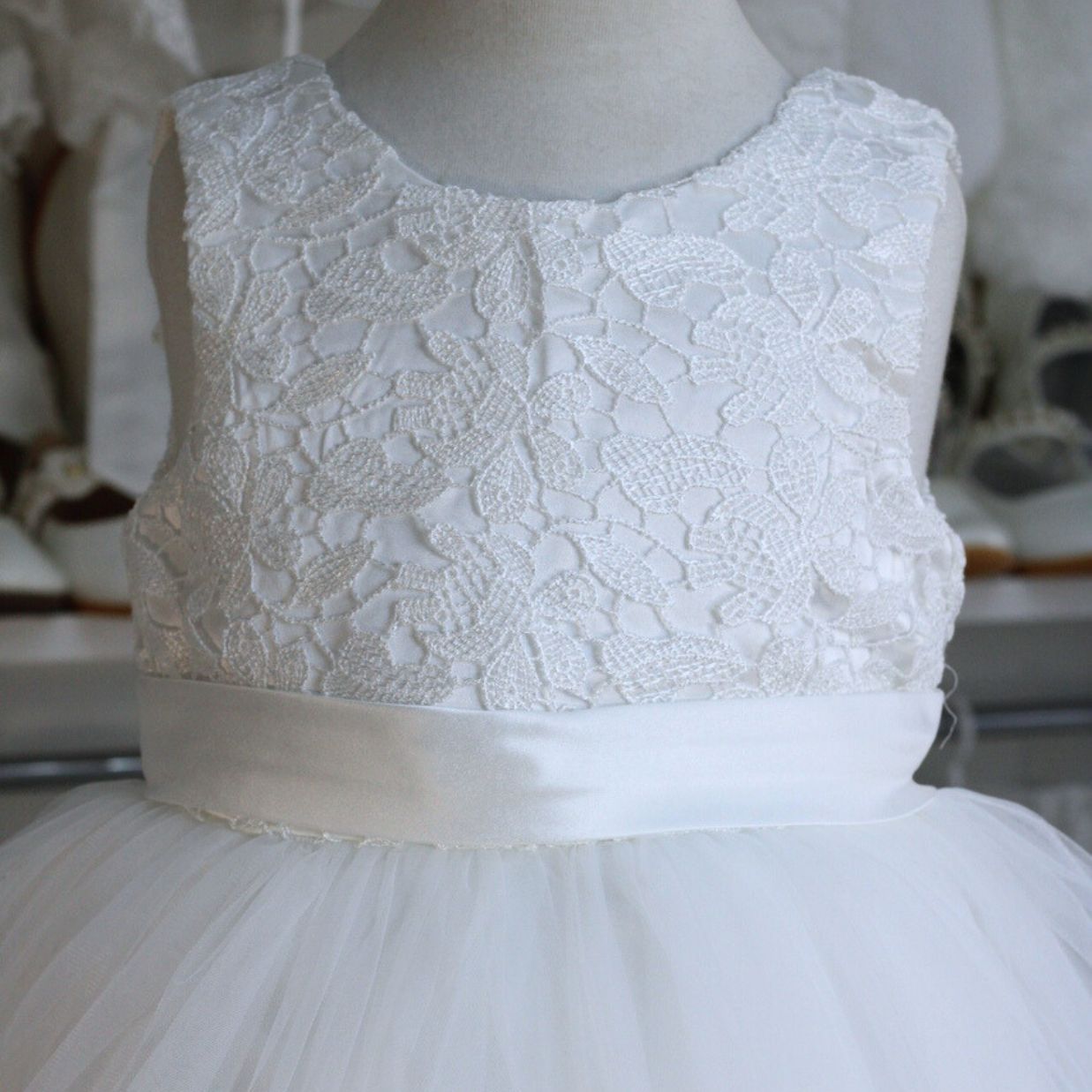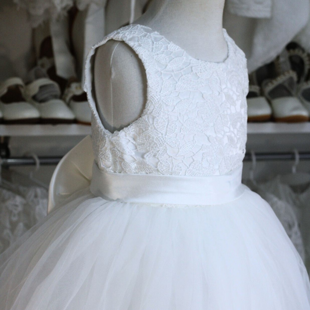 Vestido blanco para Bautizo y Primera Comunión, con bordado en la parte superior, tul en la parte inferior y espalda en v con lazo desmontable.