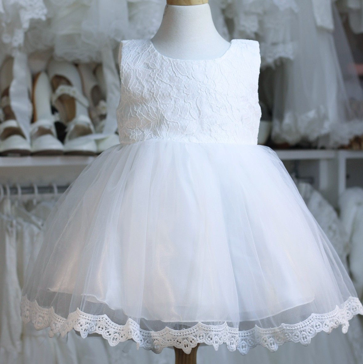 Vestido blanco para Bautizo, con tela bordada en la parte superior y tul con encaje en la parte inferior.
