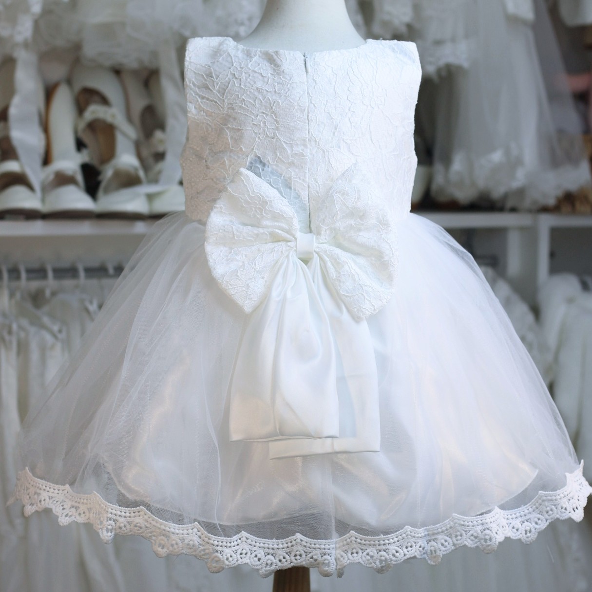 Vestido blanco para Bautizo, con tela bordada en la parte superior y tul con encaje en la parte inferior.